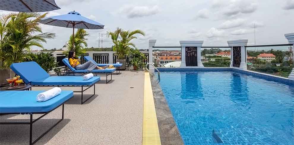 Het hotel heeft een eindeloze lijst van voorzieningen, waaronder een buitenzwembad en spadiensten. De kamers zijn modern, ruim en goed uitgerust met comfortabele bedden, moderne voorzieningen en een balkon met uitzicht op het zwembad of de stad. Het hotelrestaurant serveert uitstekende Khmer-cuisine en het ontbijtbuffet is heerlijk en gevarieerd.