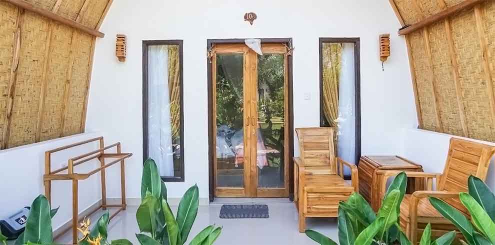 De bungalows zijn gemaakt van natuurlijke materialen zoals hout en steen. De inrichting is eenvoudig maar smaakvol, met Balinese accenten die zorgen voor een authentieke sfeer. Geniet van uw ochtendkoffie op uw privéterras.