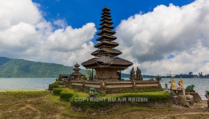Vervolgens bezoeken we de meest gefotografeerde tempel van Bali, de Pura Ulun Danu Bratan. Deze tempel is gewijd aan de godin Dewi Danu, de godin van het water, de meren en de rivieren. Het complex is gebouwd in 1633 en is verdeeld over verschillende eilandjes. De Meru pagode, met elf daken is gewijd aan Shiva en zijn gemalin Parvati. Het Bratan meer staat bekend als een heilig bergmeer. Het altaar in de Pura Ulun Danu Bratan stond jaren geleden in een lager gelegen tempel. Bij de uitbarsting van de vulkaan Batur in 1926 werden zowel het dorp als de tempel onder lava bedolven en bleef alleen het altaar van Dewi Danu gespaard. Daarom verhuisde de dorpelingen het altaar naar deze hoger gelegen tempel.