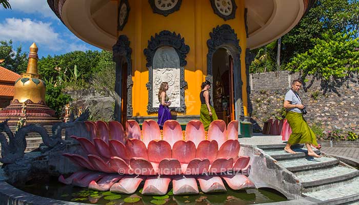 Hierna gaan we een bezoek brengen aan de prachtige Boeddhistische tempel “Brahma Vihara-Arama” in Banjar. Deze tempel uit 1969 behoort tot één van de grootste tempels van Bali. Het tempelcomplex is gelegen op een heuvel en doet qua bouwstijl denken aan de Borobudur. Vanuit het complex heeft u een schitterend uitzicht over de omgeving. Vanwege de rustige ligging is het tempelcomplex de perfecte locatie om te mediteren. Via allerlei trappen komt u steeds hoger in het tempelcomplex. De tempel bestaat uit 5 belangrijke complexen. De eerste is de Uposatha Gara, welke is gelegen in het westelijke deel. U ziet hier Boeddhabeelden en vele kunstwerken over de geboorte van Boeddha. De tweede is de Dharmasala, gelegen in het oostelijke deel. Deze ruimte wordt gebruikt als conferentiekamer, hier kunnen de monniken studeren. De derde is de Stoepa, gelegen in het noordwestelijk van het tempelcomplex. De vierde is de Bodi, gelegen in het zuidwestelijk deel. Deze plaats symboliseert de overwinning van Boeddha, wanneer hij de eeuwige perfectie (nirvana) bereikt. De vijfde is de Kuti. Ook deze ruimte wordt door de monniken gebruikt om te studeren en te mediteren. Op het hoogste niveau van het tempelcomplex bevindt zich een prachtige tuin en een reusachtige stupa die gebouwd is in de vorm van de Borobudur.