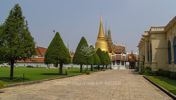 Het Koninklijk Paleis is een groot complex van ongeveer 218.400 m2 en is omgeven door muren en gebouwd in 1782. De totale lengte van de muren bedraagt 1900 meter. Binnen de muren vindt u regeringsgebouwen, de Koninklijke Kapel van de Emerald Boeddha en Koninklijke residenties.Toen Siam het recht en orde herstelde, na de val van Ayutthaya, leefde de monarchie in Thonburi, op de westoever van de Chao Phraya rivier. Rama I verhuisde het centrum van de administratie ook naar deze kant van de rivier. Er werden op deze plaats kloosters en andere publieke gebouwen geplaatst. Ook werd er een paleis gebouwd, die niet alleen diende als zijn residentie maar ook plaats maakte voor regeringsgebouwen. Het paleis kreeg in die tijd haar naam, Grand Palace oftewel het Koninklijk Paleis. U komt ogen tekort! Het complex ziet er schitterend uit met haar prachtige goudkleurige tempels. Ook de tuinen, voorzien van prachtige bonsaibomen zijn erg indrukwekkend. De meeste bezienswaardigheden mogen gefilmd en gefotografeerd worden, echter niet allemaal. Let goed op de voorschriften en neem bij de ingang een informatieboekje mee. Deze zijn in verschillende talen verkrijgbaar. De gids geeft u graag uitleg over de verschillende gebouwen. Let op: gepaste kleding tijdens deze excursie is vereist. Korte broeken, mouwloze shirts en teenslippers zijn niet toegestaan.